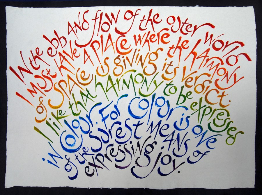 The ‘prospect of happiness’ in the title is the view from the top of Hampstead Heath across London to the Surrey hills beyond, in Frances Bingham’s novel The Principle of Camouflage – one of the word-landscapes in the show. In others, Virginia Woolf visits Kenwood and the Heath, and takes a bus along Tufnell Park Road on her way to see her friend Roger Fry in Huddlestone Road – she also bravely crosses Blackfriars Bridge by night. We catch a glimpse of Constable, Keats and Dr Johnson all doing their thing locally, and visit Persian plane trees in London with Handel and Mimi Khalvati. Words flow around Maureen Duffy in the old round Reading Room of the British Museum, and bring her a starlit vision of the city floating on the Thames. Blake celebrates ‘The fields from Islington to Marybone’, and Winifred Nicholson sees the view through a rainbow prism of harmony and hope.